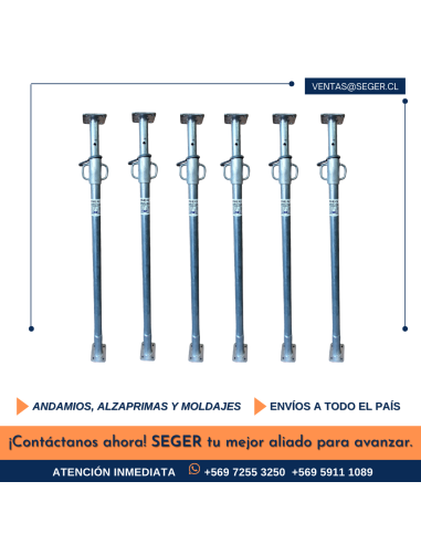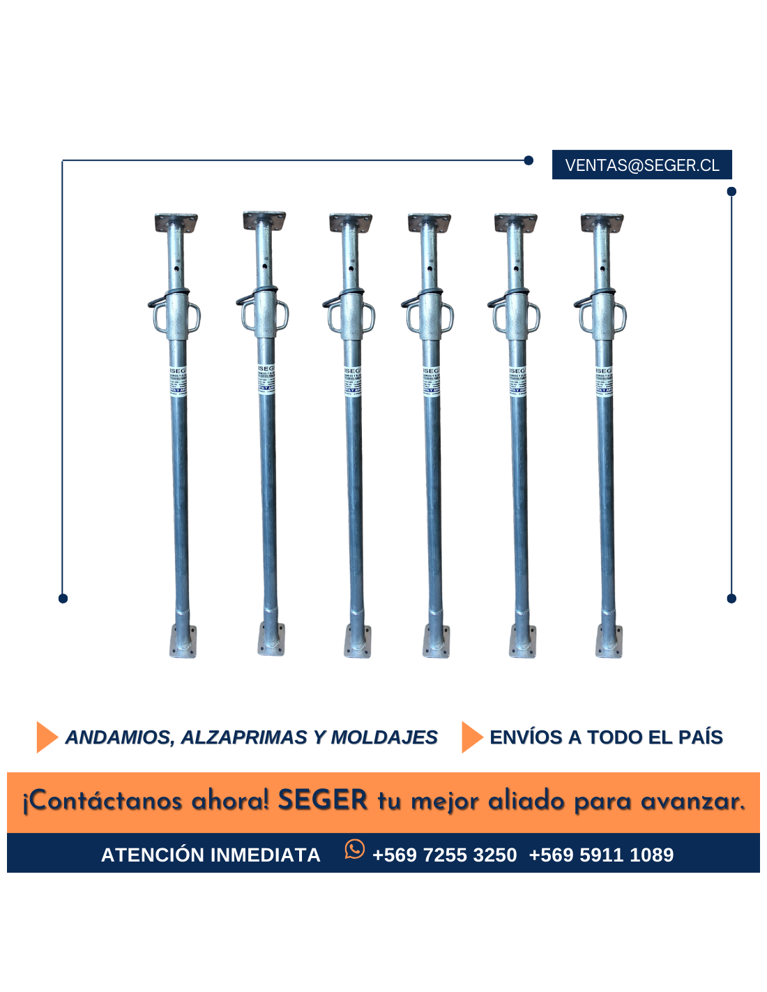 Puntal telescópico de acero galvanizado, fabricado con tubo exterior de 56mm y 48mm. Base de 5 mm o 6 mm de espesor según sea el caso. Las alzaprimas, también conocidas como puntales de construcción, se utilizan para el apuntalamiento y soporte de estructuras en construcción, como losas, muros, vigas y encofrados.