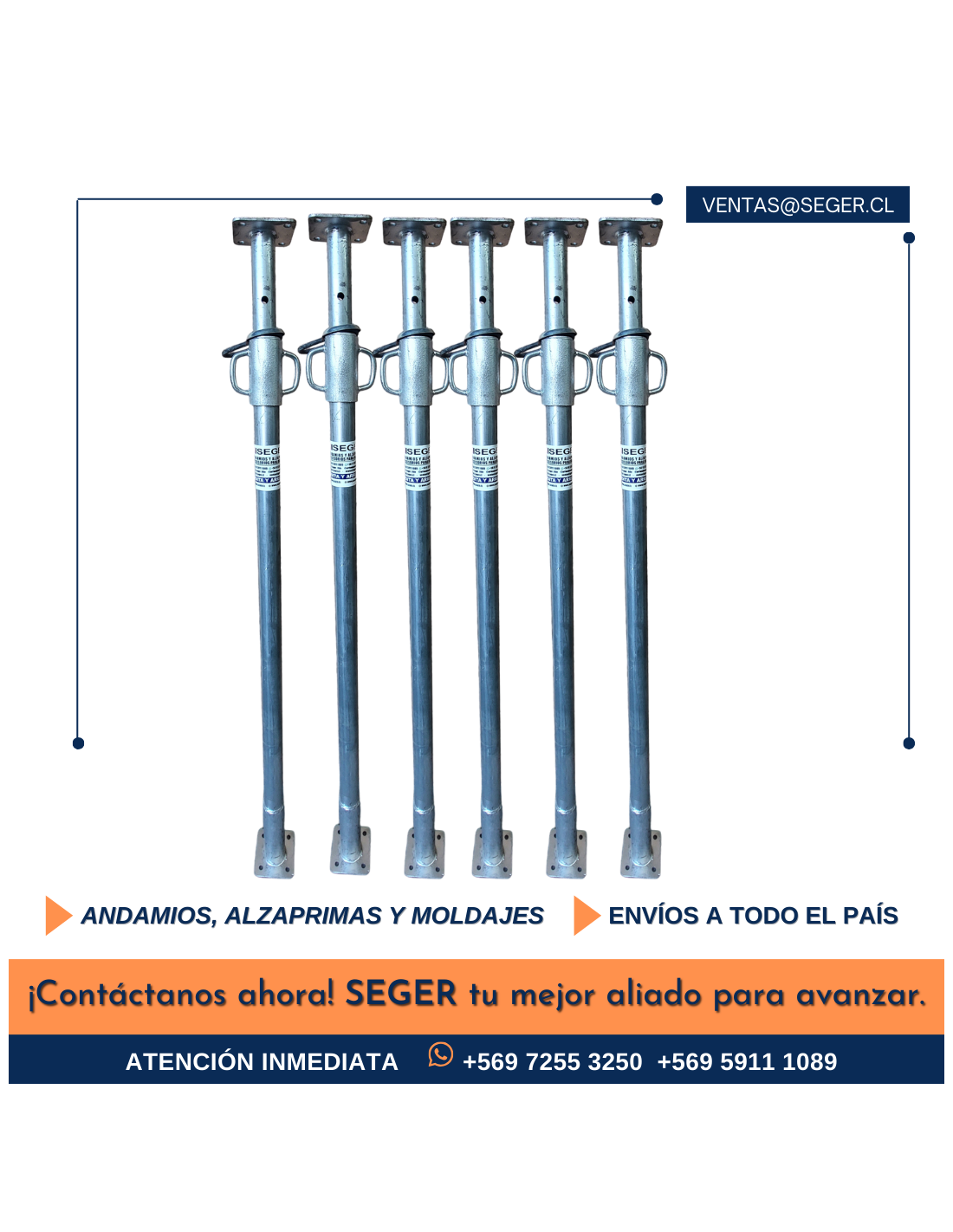 Puntal telescópico de acero galvanizado, fabricado con tubo exterior de 56mm y 48mm. Base de 5 mm o 6 mm de espesor según sea el caso. Las alzaprimas, también conocidas como puntales de construcción, se utilizan para el apuntalamiento y soporte de estructuras en construcción, como losas, muros, vigas y encofrados.