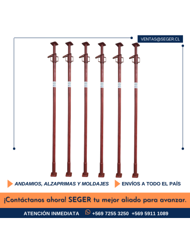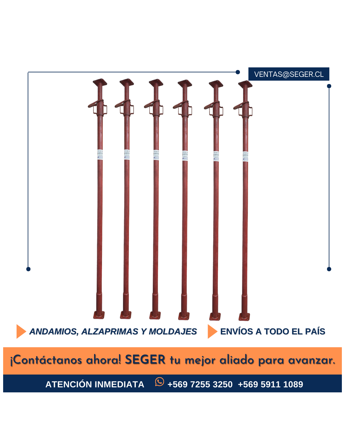 Puntal telescópico de acero galvanizado, fabricado con tubo exterior de 56mm y 48mm. Base de 5 mm o 6 mm de espesor según sea el caso. Las alzaprimas, también conocidas como puntales de construcción, se utilizan para el apuntalamiento y soporte de estructuras en construcción, como losas, muros, vigas y encofrados.