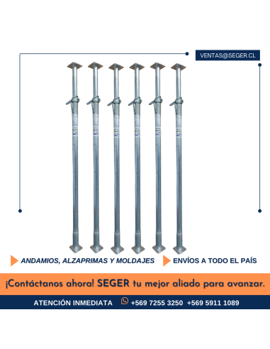 Puntal telescópico de acero galvanizado, fabricado con tubo exterior de 56mm y 48mm. Base de 5 mm o 6 mm de espesor según sea el caso. Las alzaprimas, también conocidas como puntales de construcción, se utilizan para el apuntalamiento y soporte de estructuras en construcción, como losas, muros, vigas y encofrados.