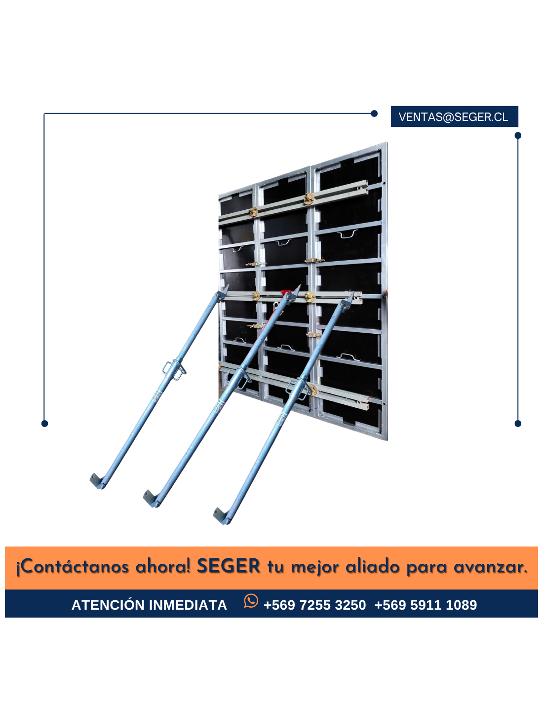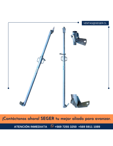 Empleado para aplome y estabilización de panel para moldaje, son de fácil adaptabilidad a las distintas pendientes de apoyo, con una distancia entre perforaciones de 100 mm para una primera regulación fine del mismo recorrido. Cabezal inferior y superior articulado con perforación para pasa hilo 15/17mm para acople con tuerca plato o hexagonal.