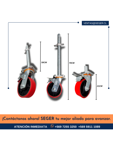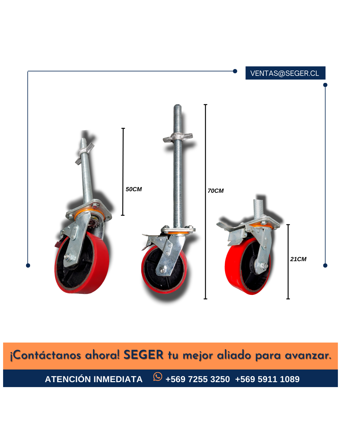 Para usos en sistemas de andamios tradicionales, permite mover el cuerpo de andamio en diferentes direcciones, una vez que se encuentra en la posición deseada se puede colocar el freno para que se mantenga inmóvil.